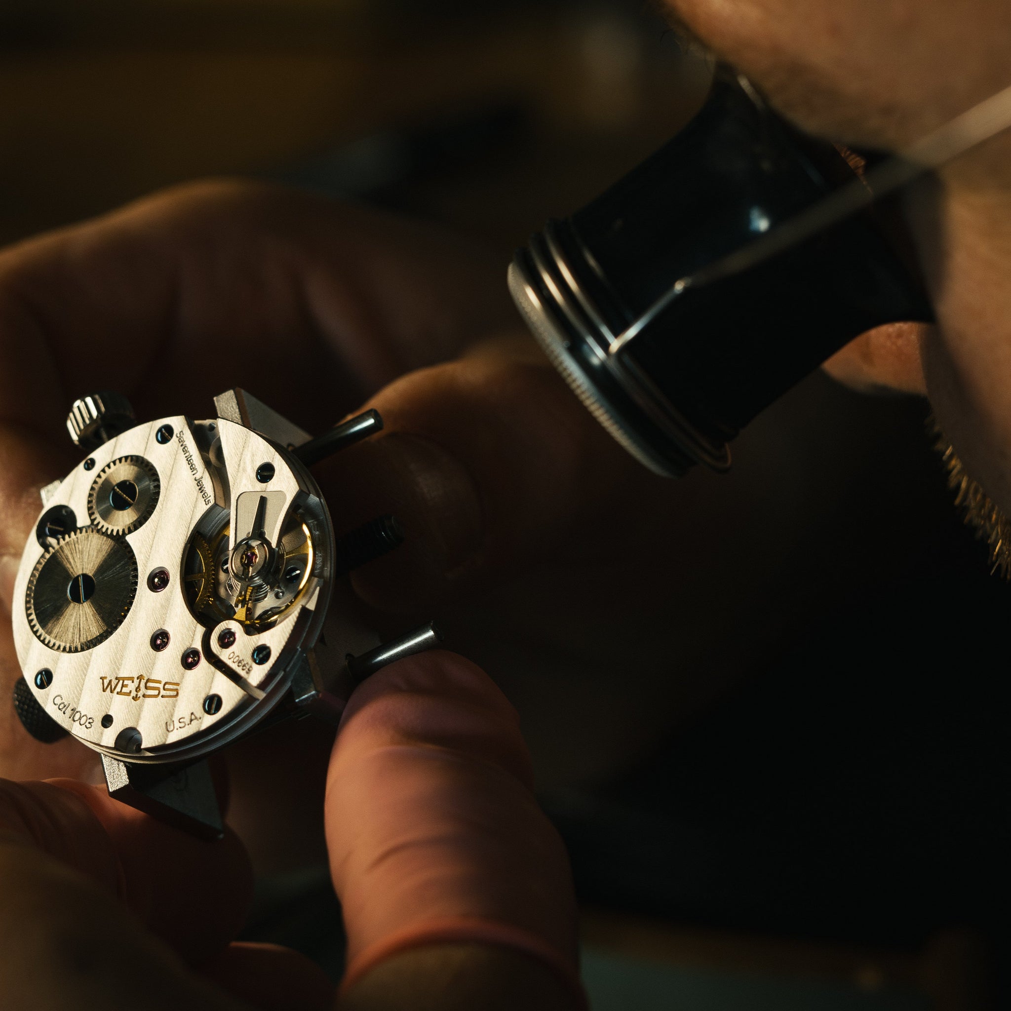 In 2013, Cameron founded Weiss Watch Company with his wife, Whitney, and their Labrador, Jules. The first ten timepieces, each requiring over 300 hours of work, were hand-finished and assembled in their dining room.